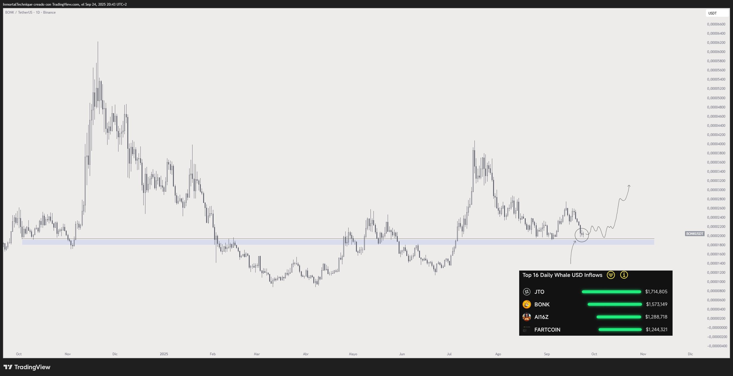 Looking at the altcoin market, the trader predicts that the meme token Bonk (BONK) will surge as long as it stays above $0.000018. He also notes that crypto whales have been accumulating BONK over the past few weeks.